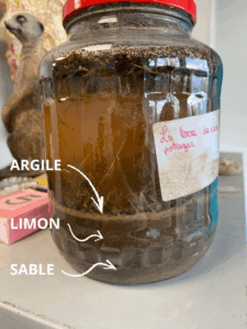 - Le test du bocal : un peu de terre et de l’eau dans un bocal qu’on mélange bien. Laisser décanter quelques jours et les différentes couches de sol vont apparaître.