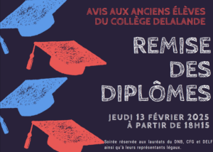 Avis à tous les anciens et anciennes élèves du collège Delalande ! Le collège est heureux de vous accueillir le Jeudi 13 Février à partir de 18h15 pour la remise des diplômes. ( DNB, CFG et DELF)
